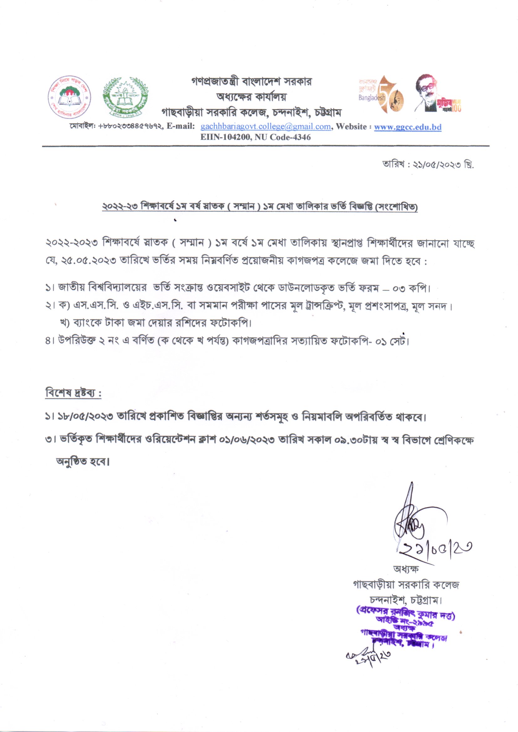 ২০২২-২৩ শিক্ষাবর্ষে ১ম বর্ষ স্নাতক ( সম্মান ) ১ম মেধা তালিকার ভর্তি বিজ্ঞপ্তি (সংশোধিত)