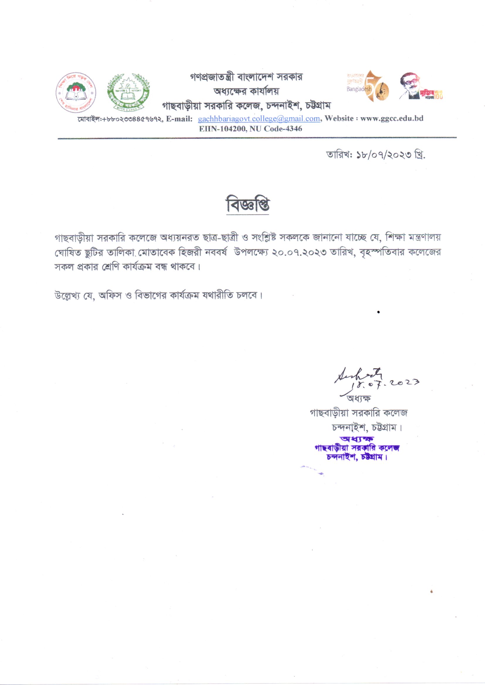 শ্রেণি কার্যক্রম স্থগিতের বিজ্ঞপ্তি