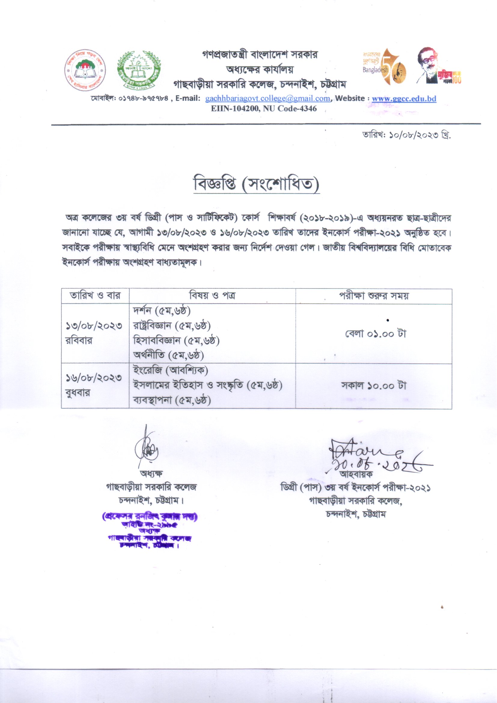 ডিগ্রী ৩য় বর্ষ ইনকোর্স পরীক্ষার সংশোধিত সময়সূচি