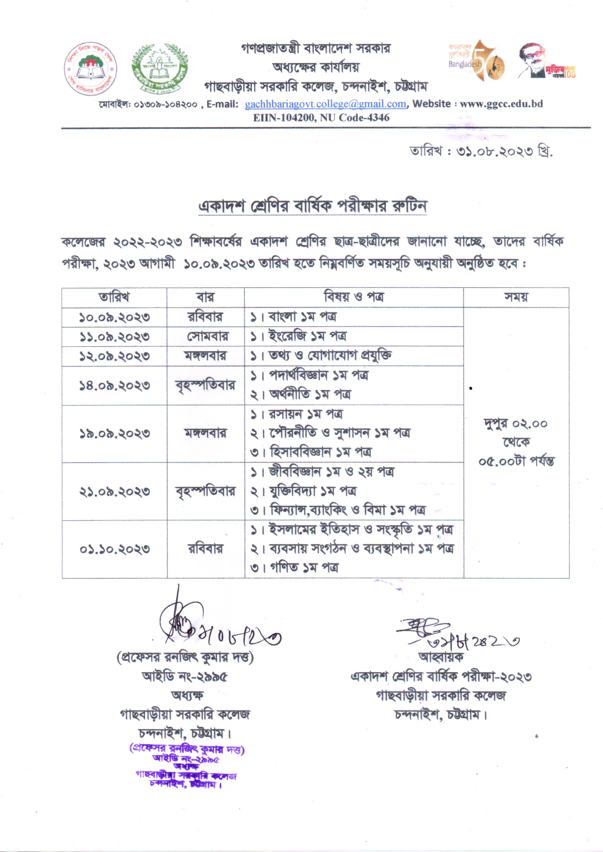 একাদশ শ্রেণির নির্বাচনি পরীক্ষা- ২০২৩ এর রুটিন