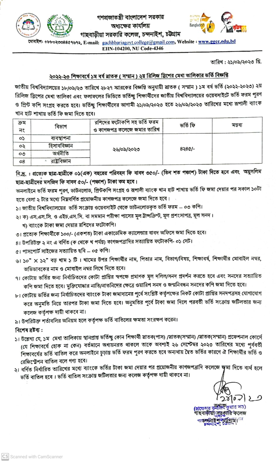 ২০২২-২৩ শিক্ষাবর্ষে ১ম বর্ষ স্নাতক ( সম্মান ) ২য় রিলিজ স্লিপে মেধা তালিকার ভর্তি বিজ্ঞপ্তি