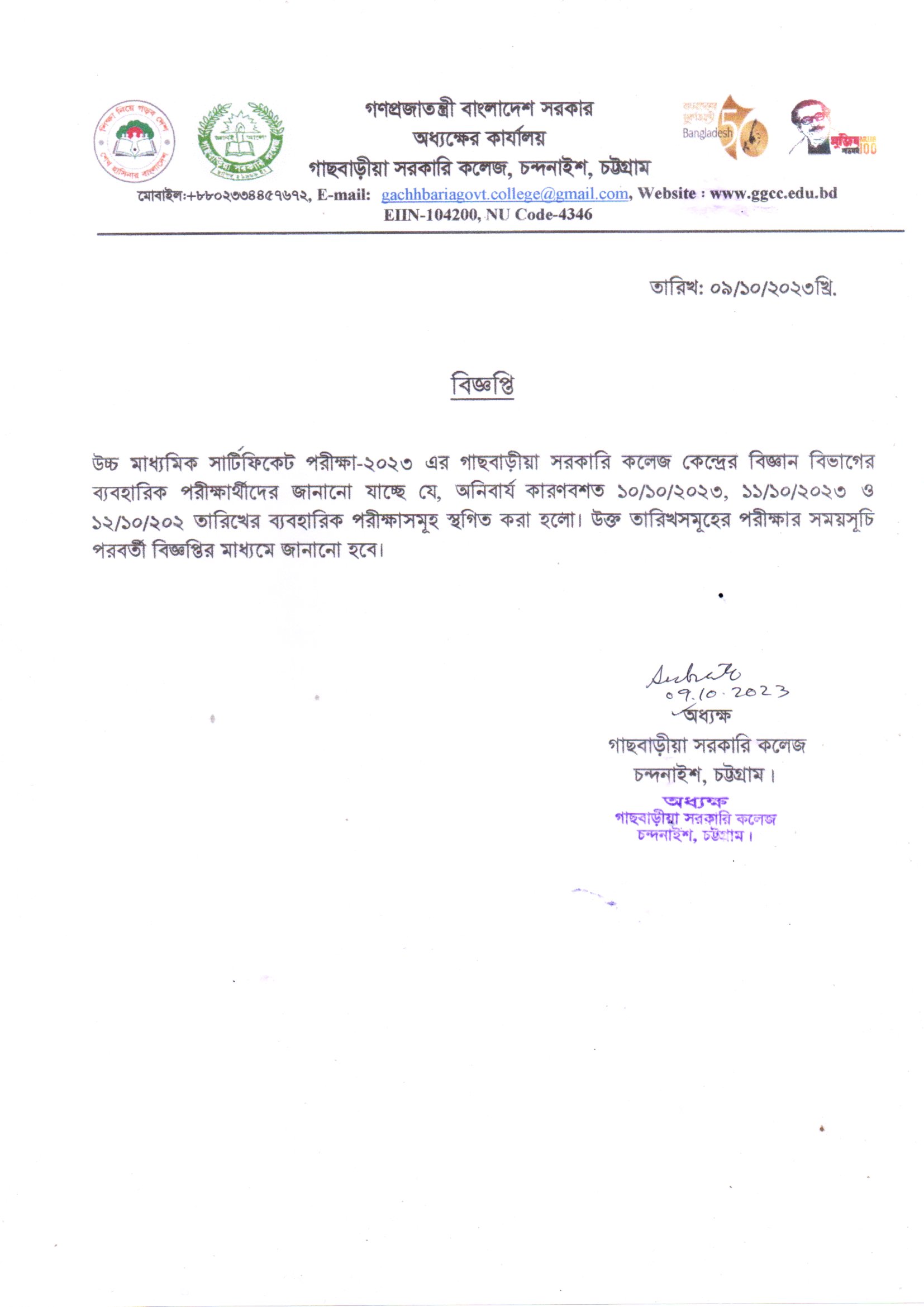 উচ্চ মাধ্যমিক পরীক্ষা- ২০২৩ এর ব্যবহারিক পরীক্ষা স্থগিত।