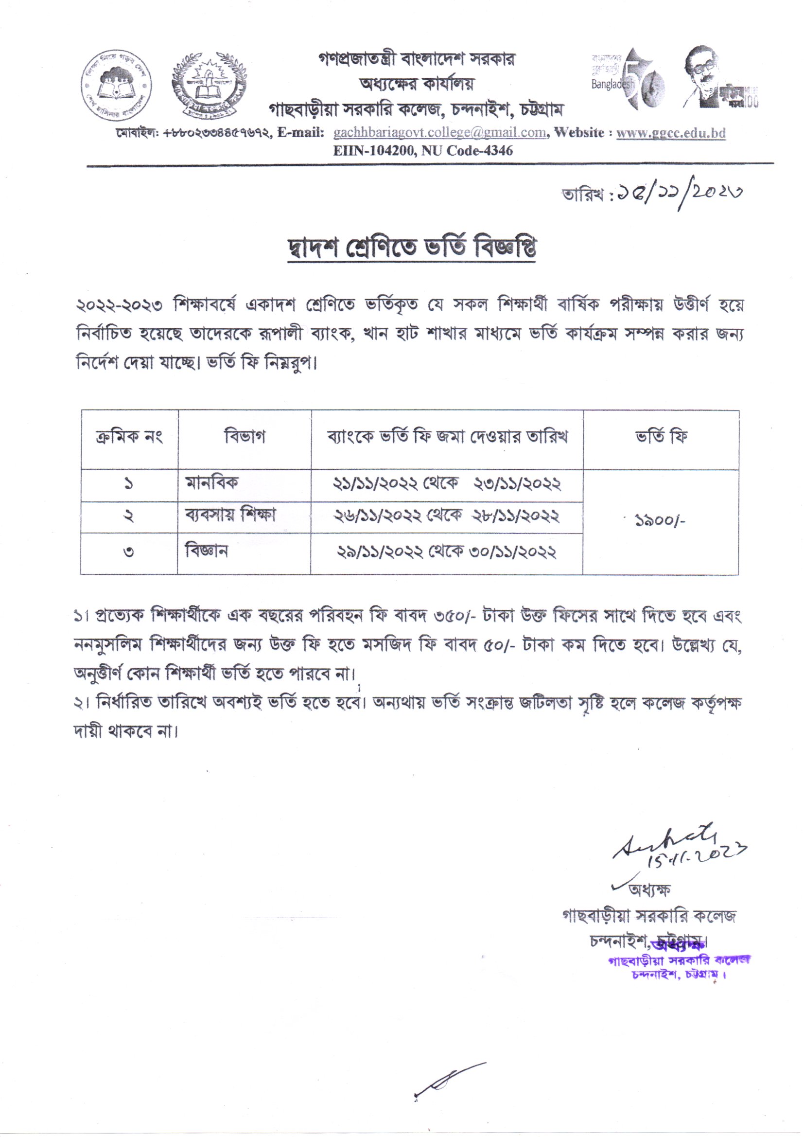 দ্বাদশ শ্রেণির ভর্তি বিজ্ঞপ্তি