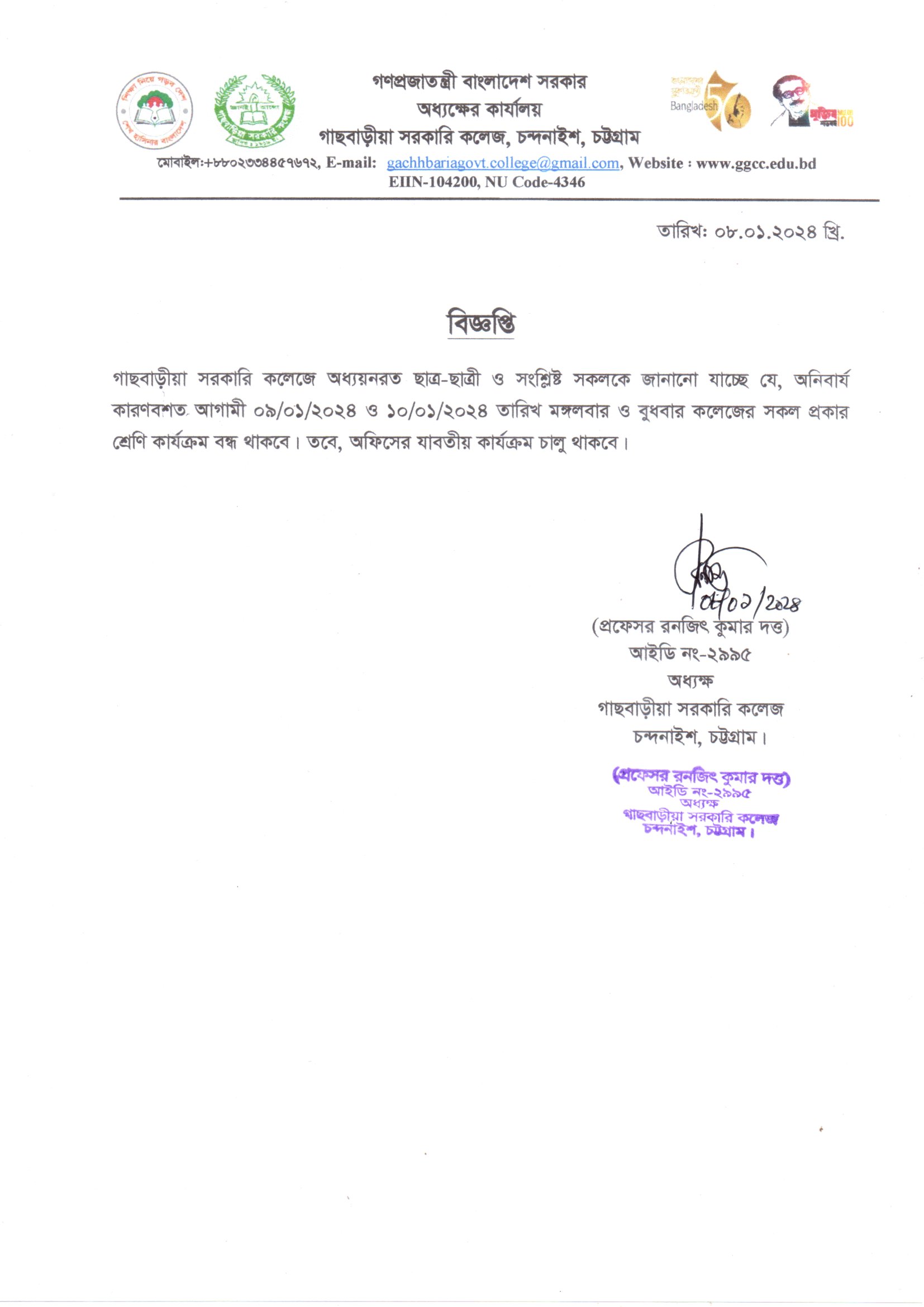 শ্রেণি কার্যক্রম বন্ধের বিজ্ঞপ্তি
