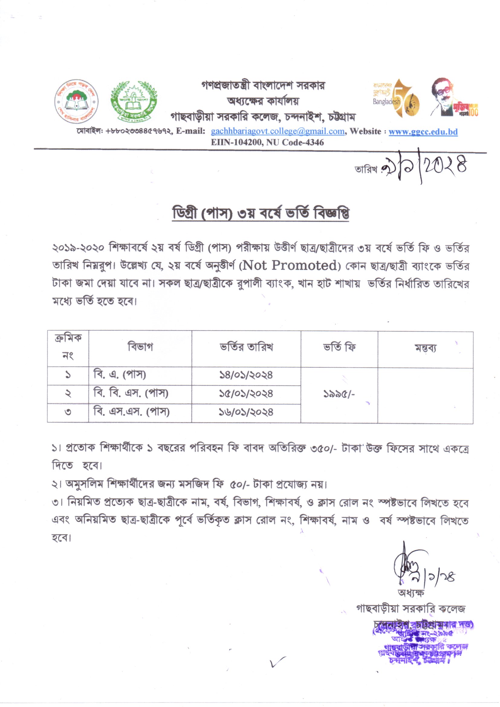 ডিগ্রী (পাস) ৩য় বর্ষে ভর্তি বিজ্ঞপ্তি