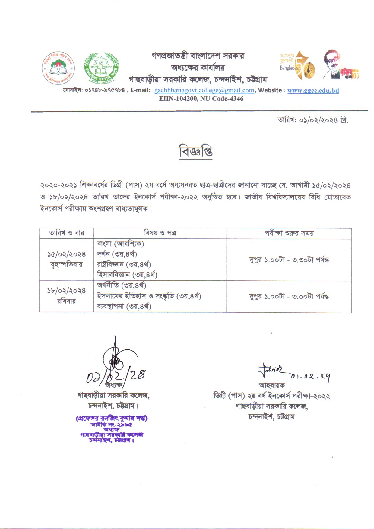 ডিগ্রী (পাস) ২য় বর্ষ ইনকোর্স পরীক্ষা
