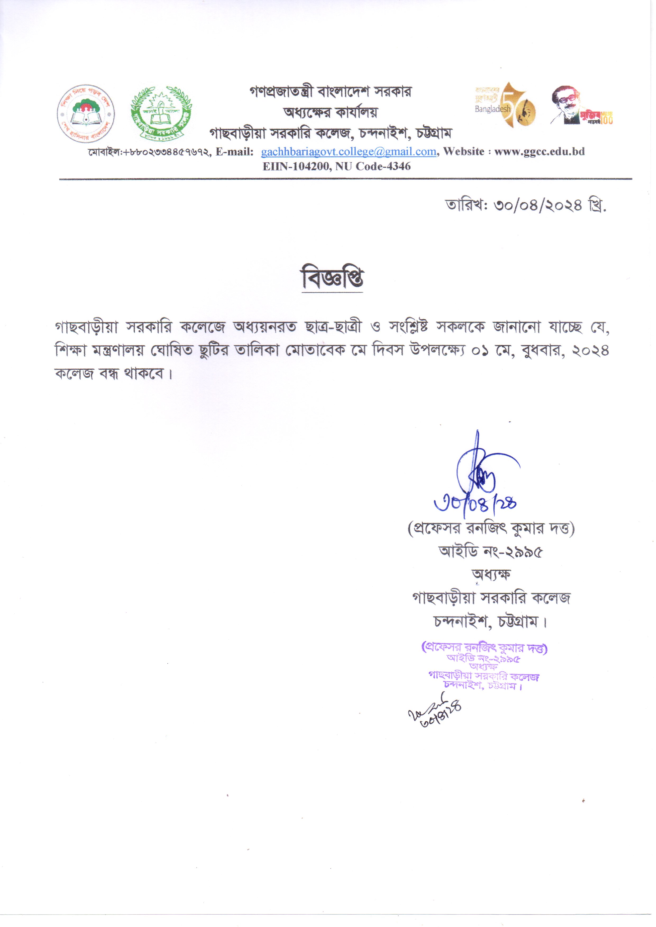 কলেজ বন্ধের বিজ্ঞপ্তি
