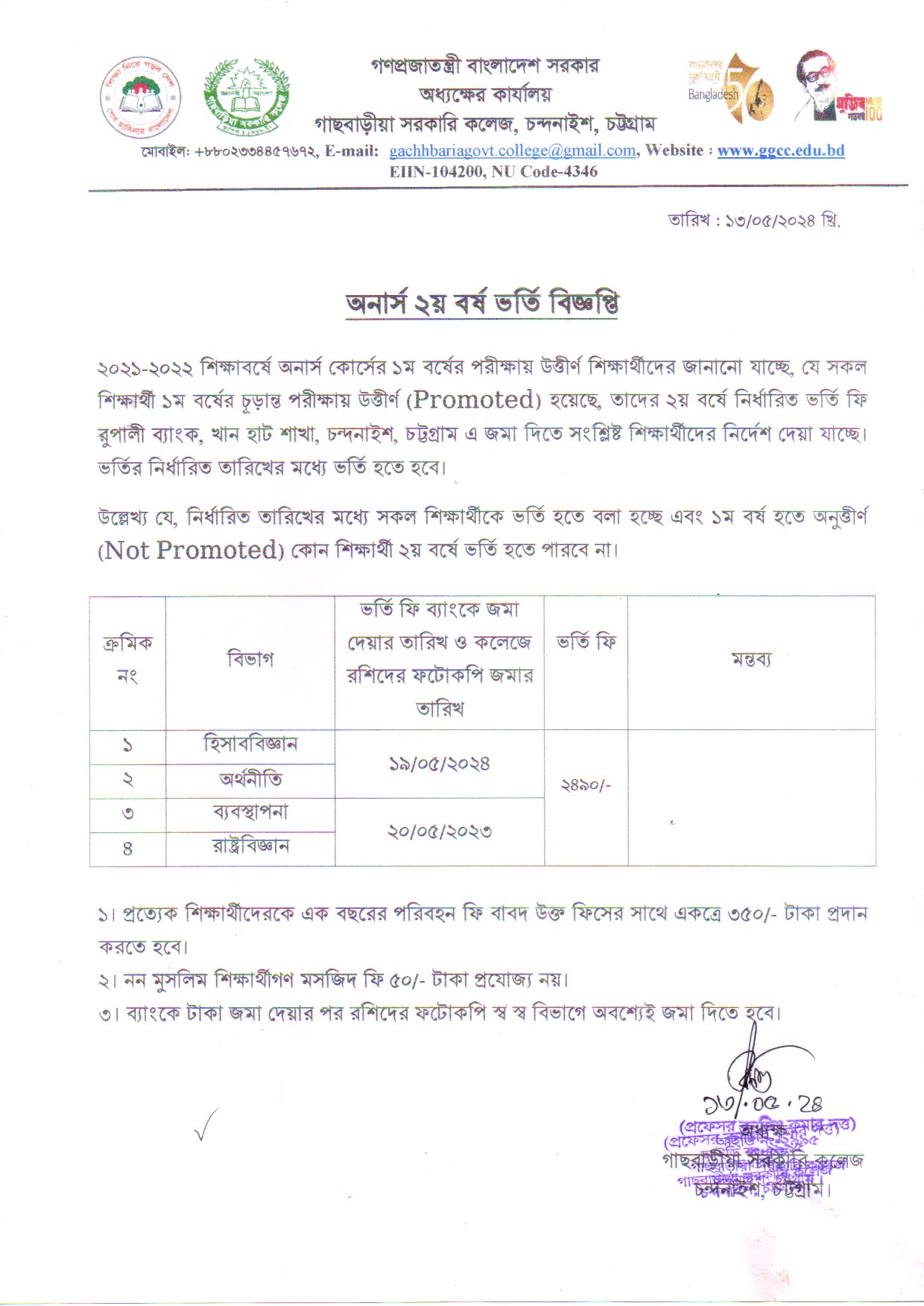 অনার্স ২য় বর্ষ ভর্তি বিজ্ঞপ্তি