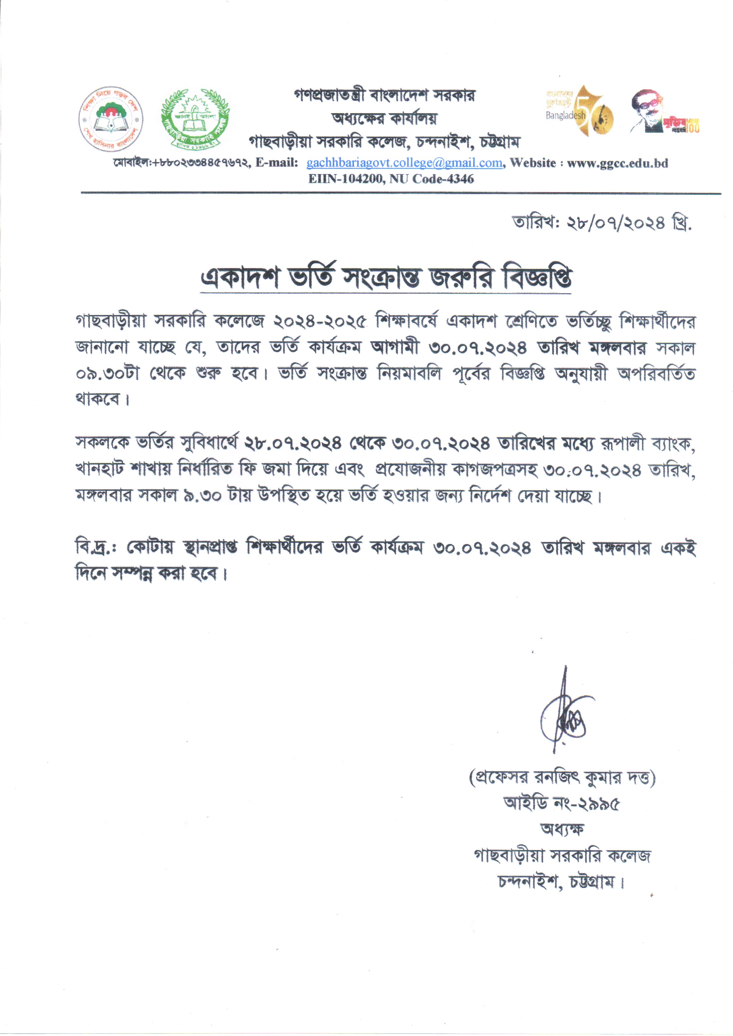 ২০২৪-২০২৫ শিক্ষাবর্ষে একাদশ শ্রেণিতে ভর্তির জরুরি বিজ্ঞপ্তি