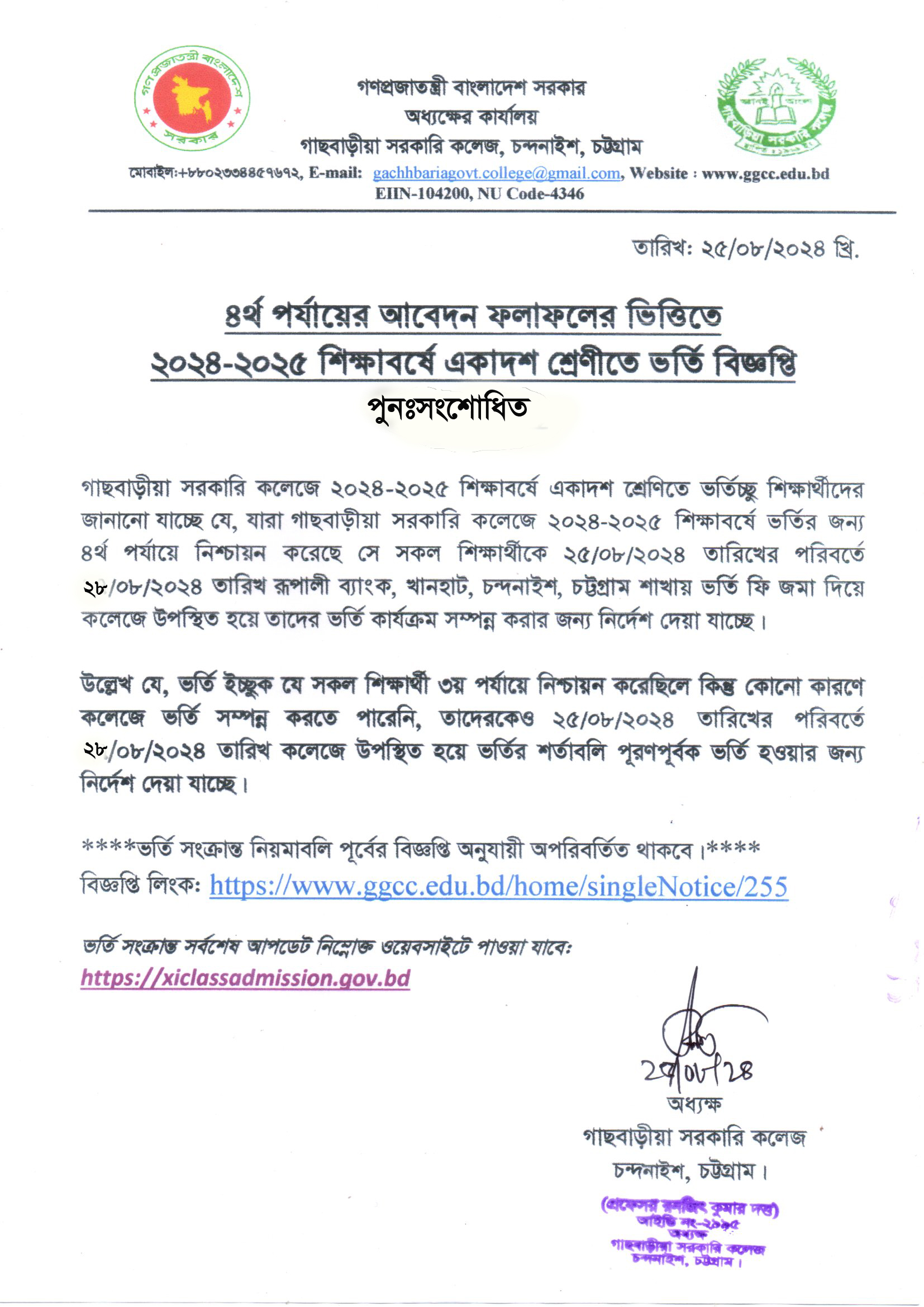 ৪র্থ পর্যায়ের আবেদন ফলাফলের ভিত্তিতে ২০২৪-২০২৫ শিক্ষাবর্ষে একাদশ শ্রেণীতে ভর্তি বিজ্ঞপ্তি (পুনঃসংশোধিত)