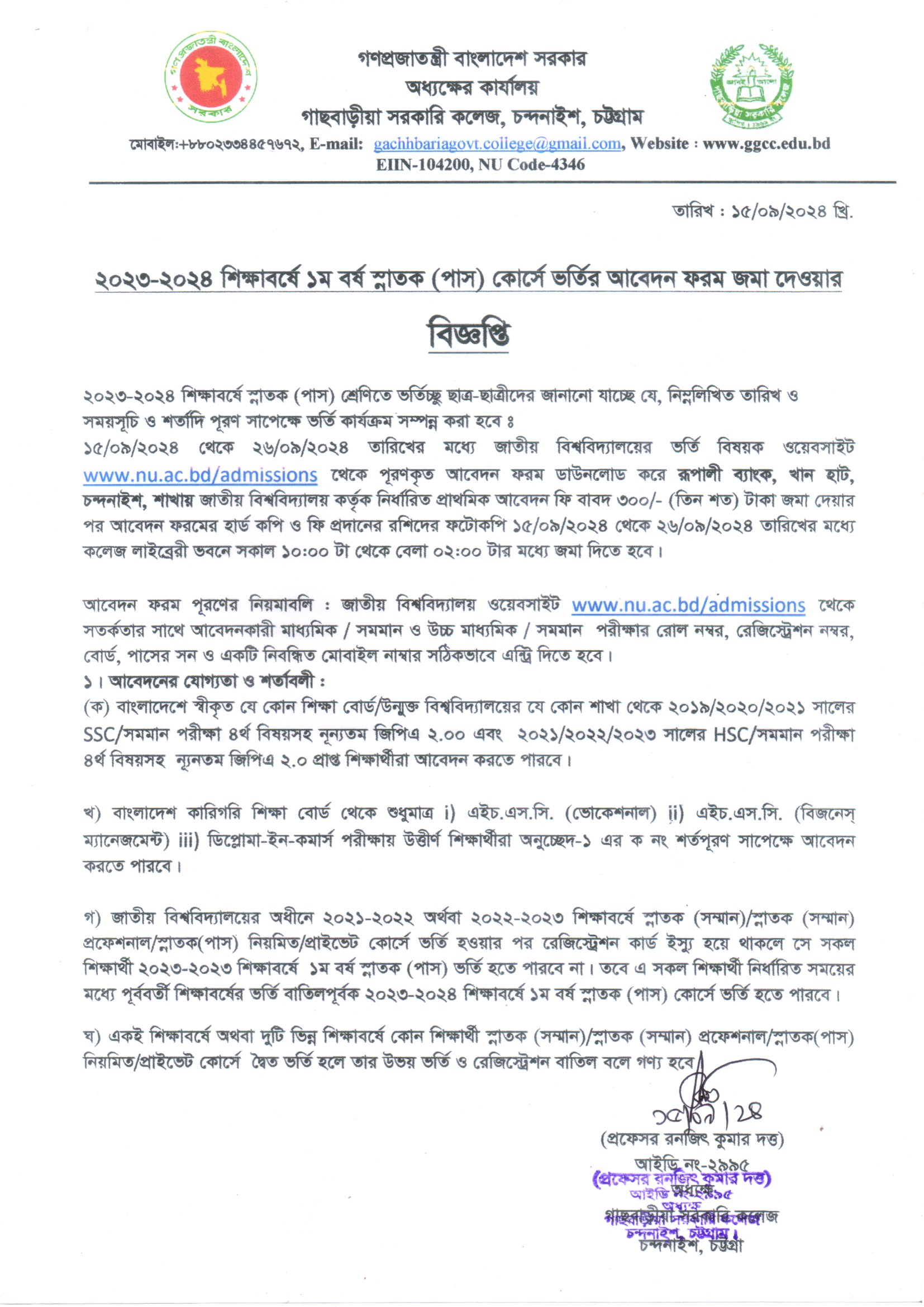 ২০২৩-২৪ শিক্ষাবর্ষে ১ম বর্ষে স্নাতক (পাস) কোর্সে ভর্তির আবেদন ফরম জমা দেয়ার বিজ্ঞপ্তি