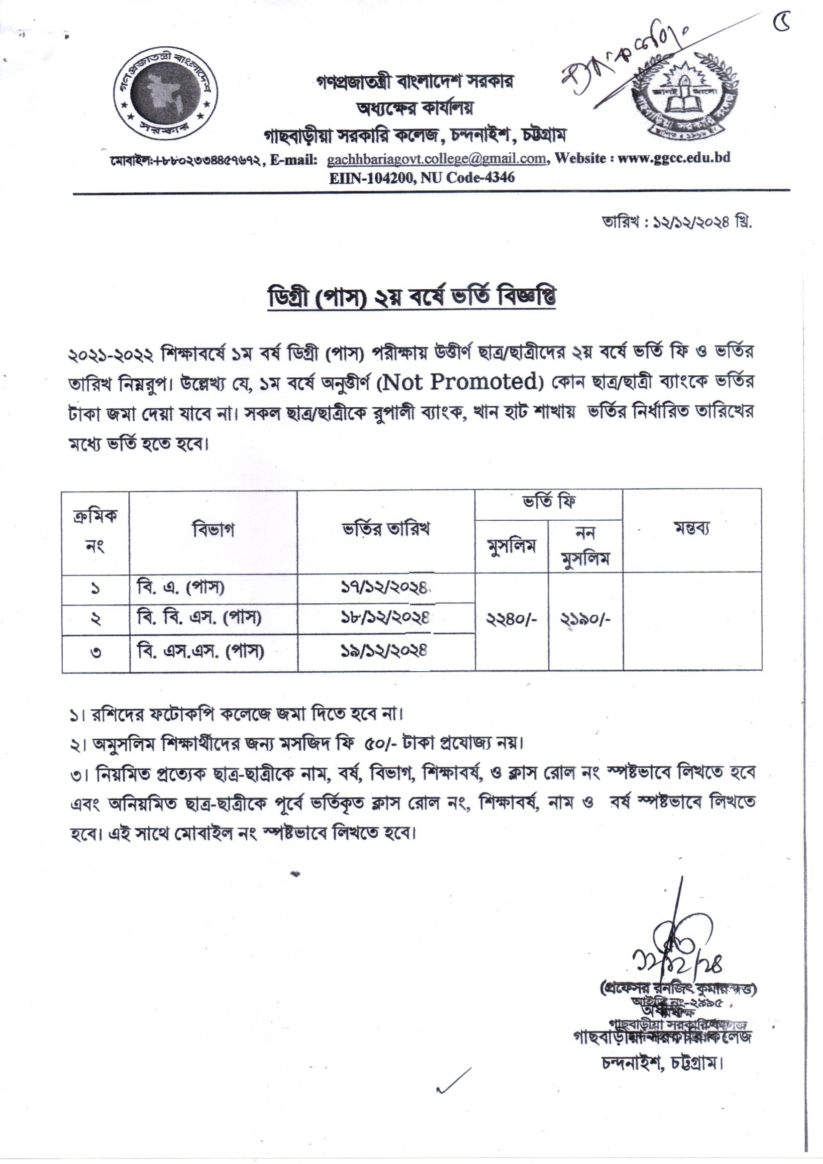 ডিগ্রি (পাস) ২য় বর্ষ ভর্তি বিজ্ঞপ্তি