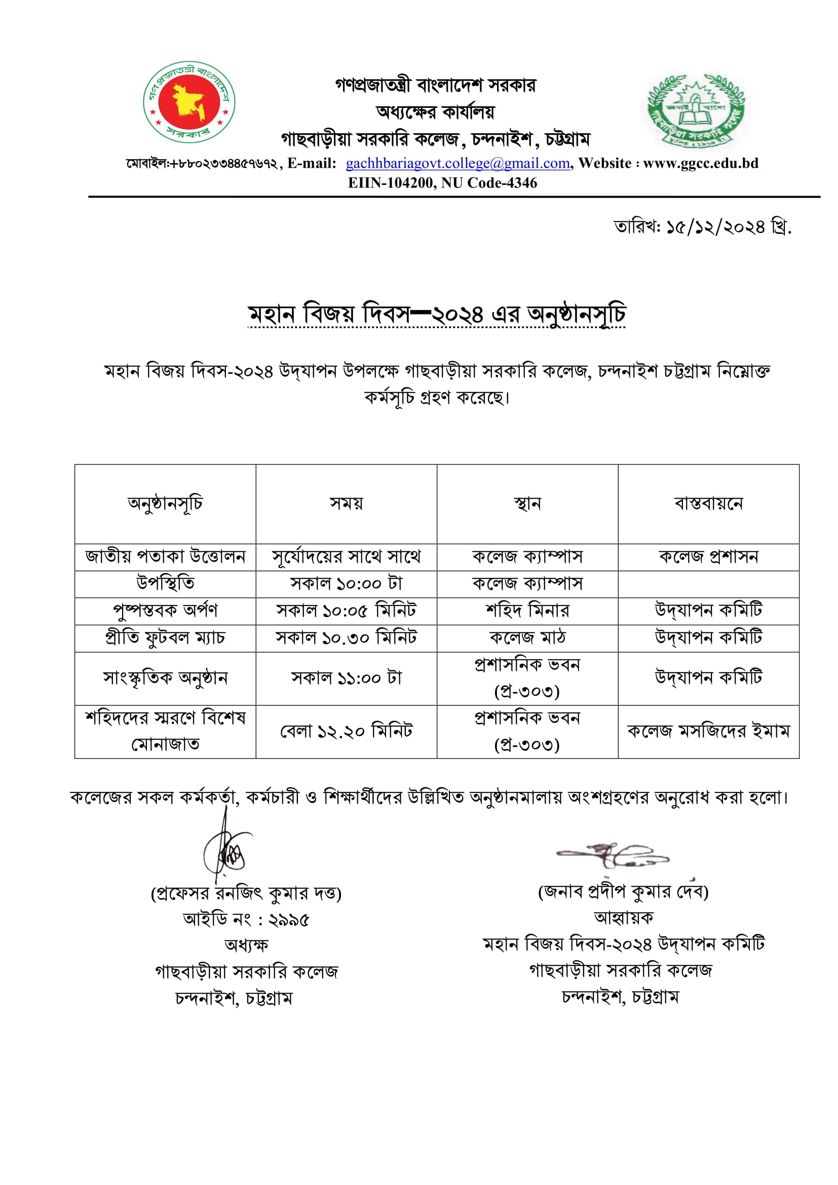 ১৬ই ডিসেম্বর ২০২৪ মহান বিজয় দিবস উদযাপন এর অনুষ্ঠানমালা