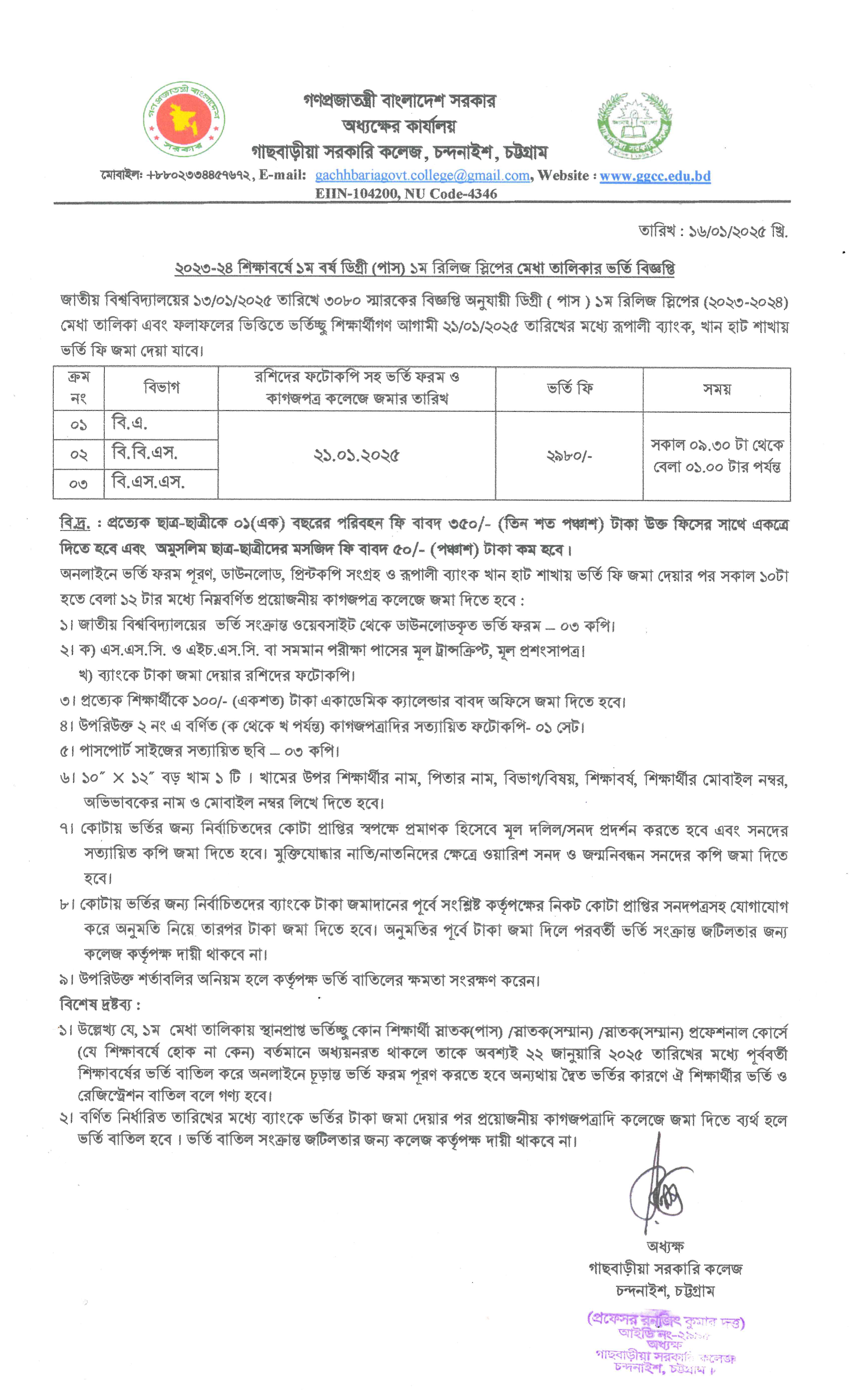 ২০২৩-২৪ শিক্ষাবর্ষে ১ম বর্ষ ডিগ্রী (পাস) ১ম রিলিজ স্লিপের মেধা তালিকার ভর্তি বিজ্ঞপ্তি