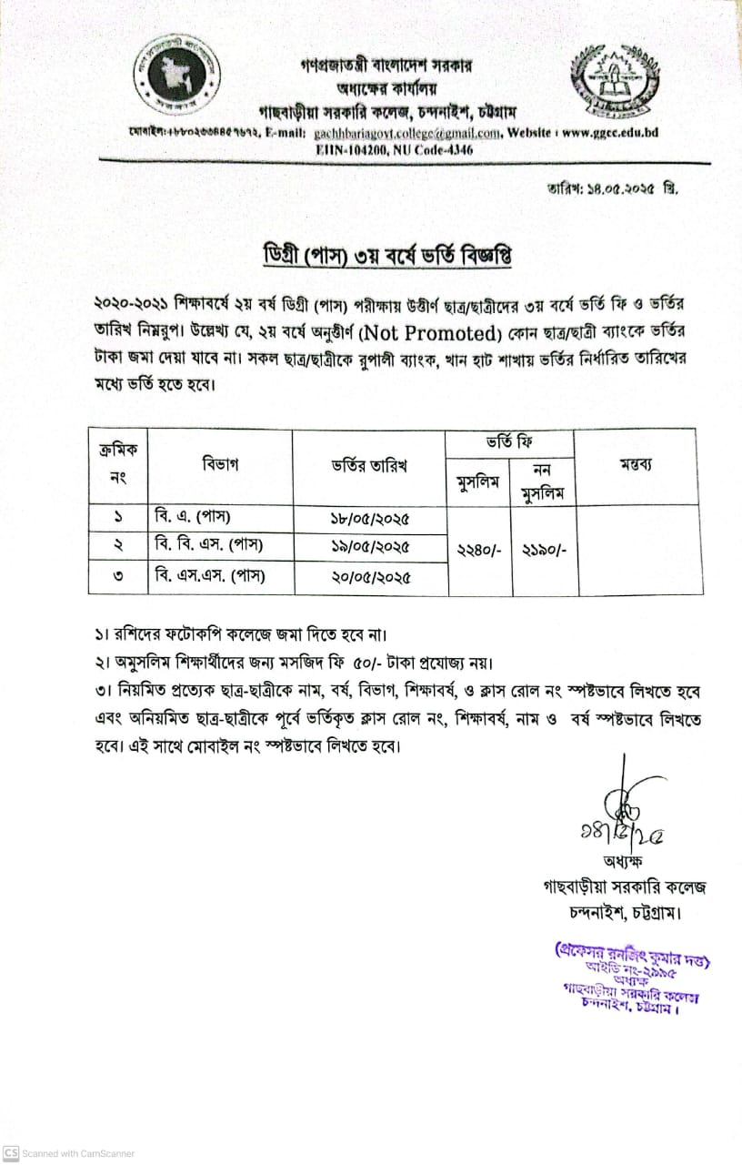 ডিগ্রী (পাস) ৩য় বর্ষে ভর্তি বিজ্ঞপ্তি