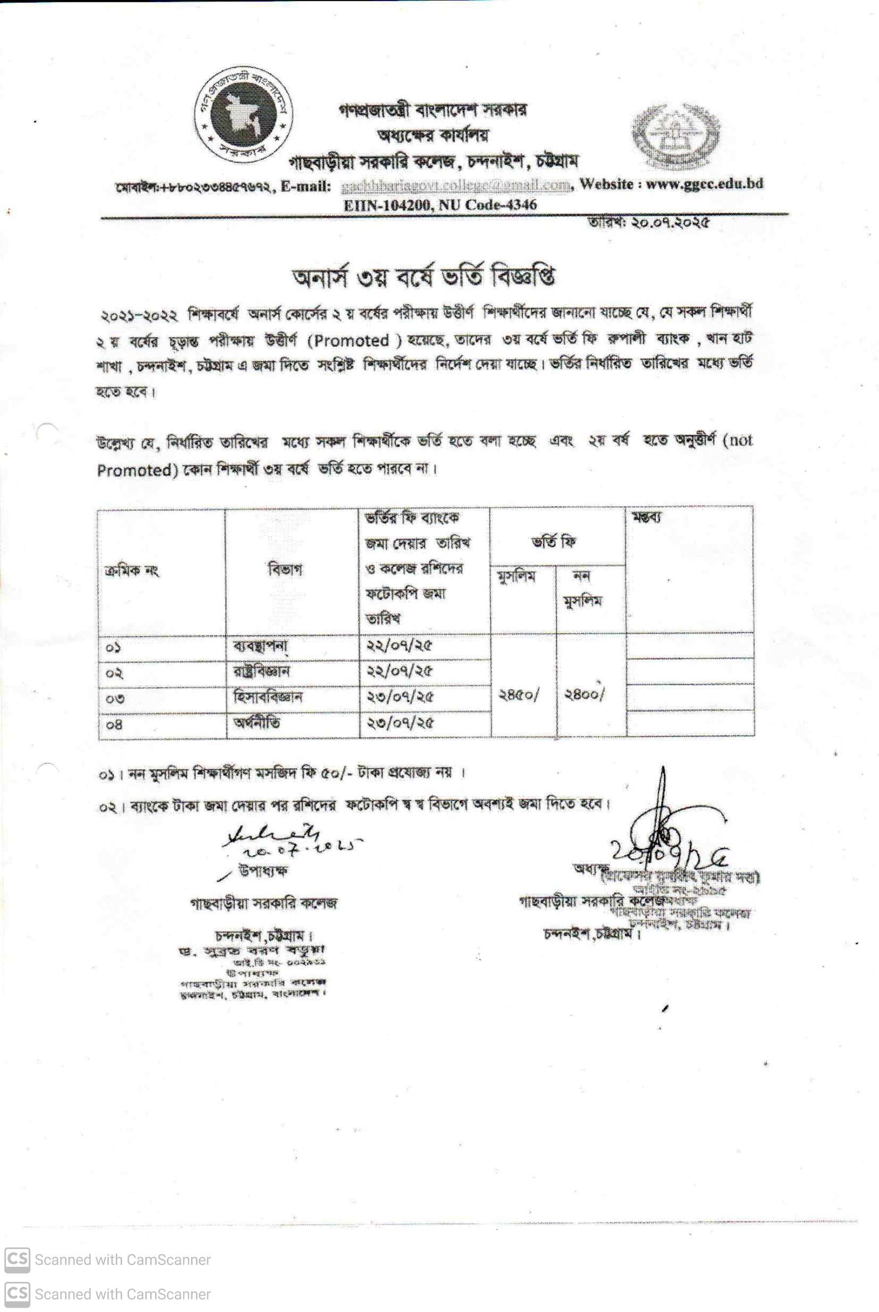অনার্স ৩য় বর্ষ ভর্তি বিজ্ঞপ্তি