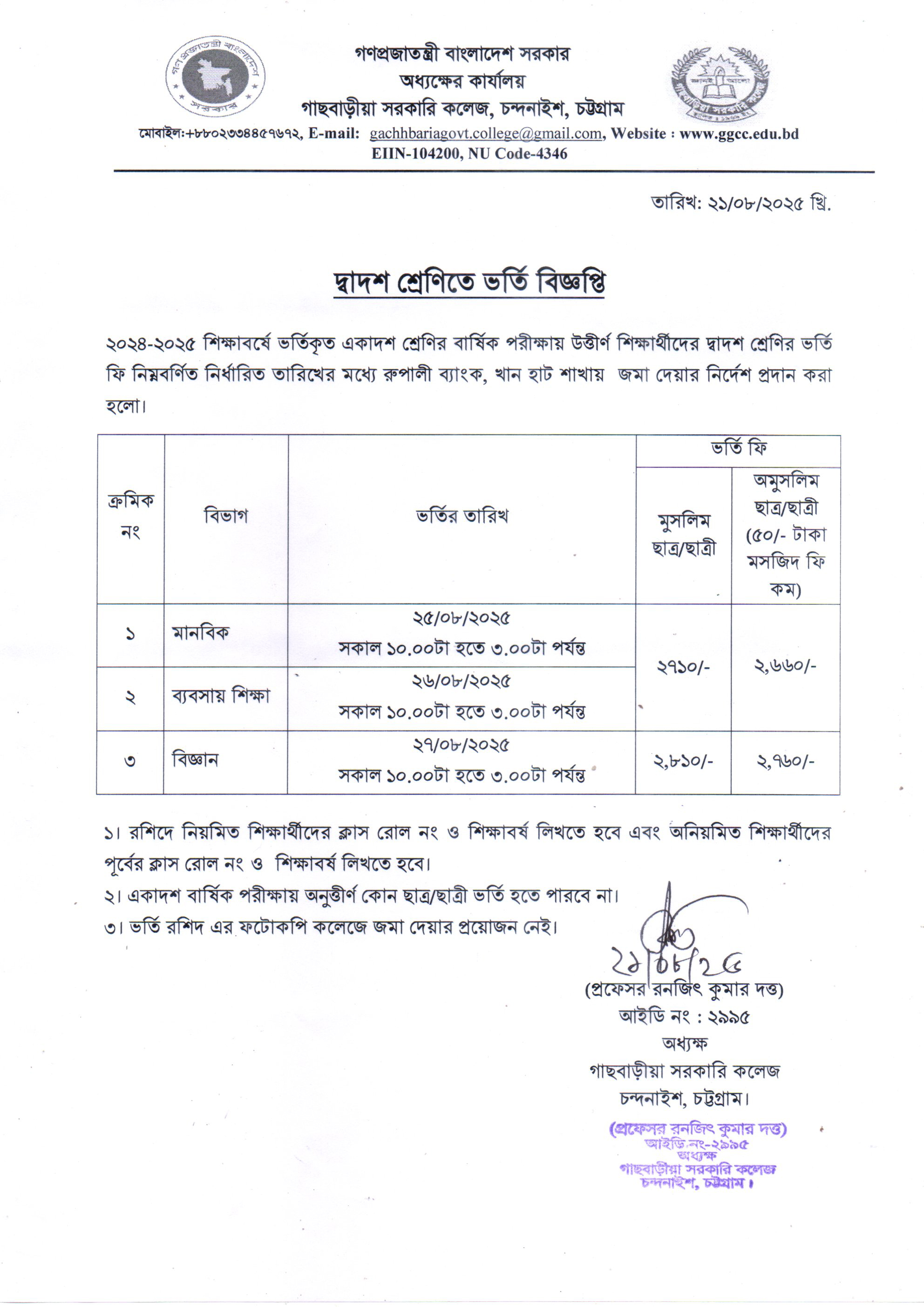 দ্বাদশ শ্রেণির ভর্তি বিজ্ঞপ্তি