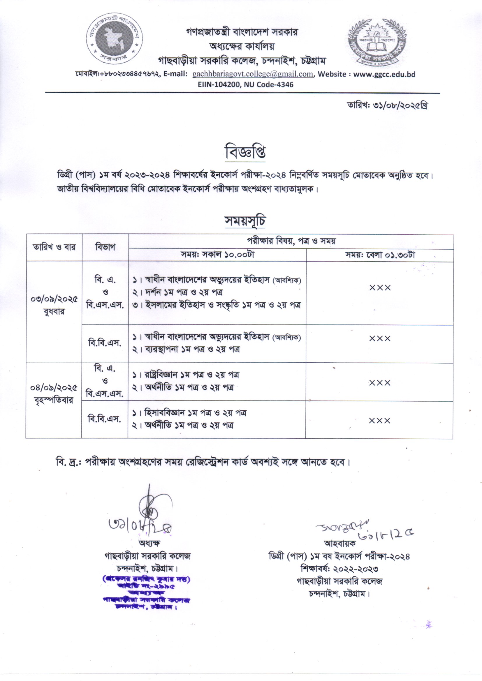 ২০২৩-২০২৪ শিক্ষাবর্ষের ডিগ্রি পাস ও সার্টিফিকেট কোর্স ১ম বর্ষ ইনকোর্স পরীক্ষার সময়সূচি