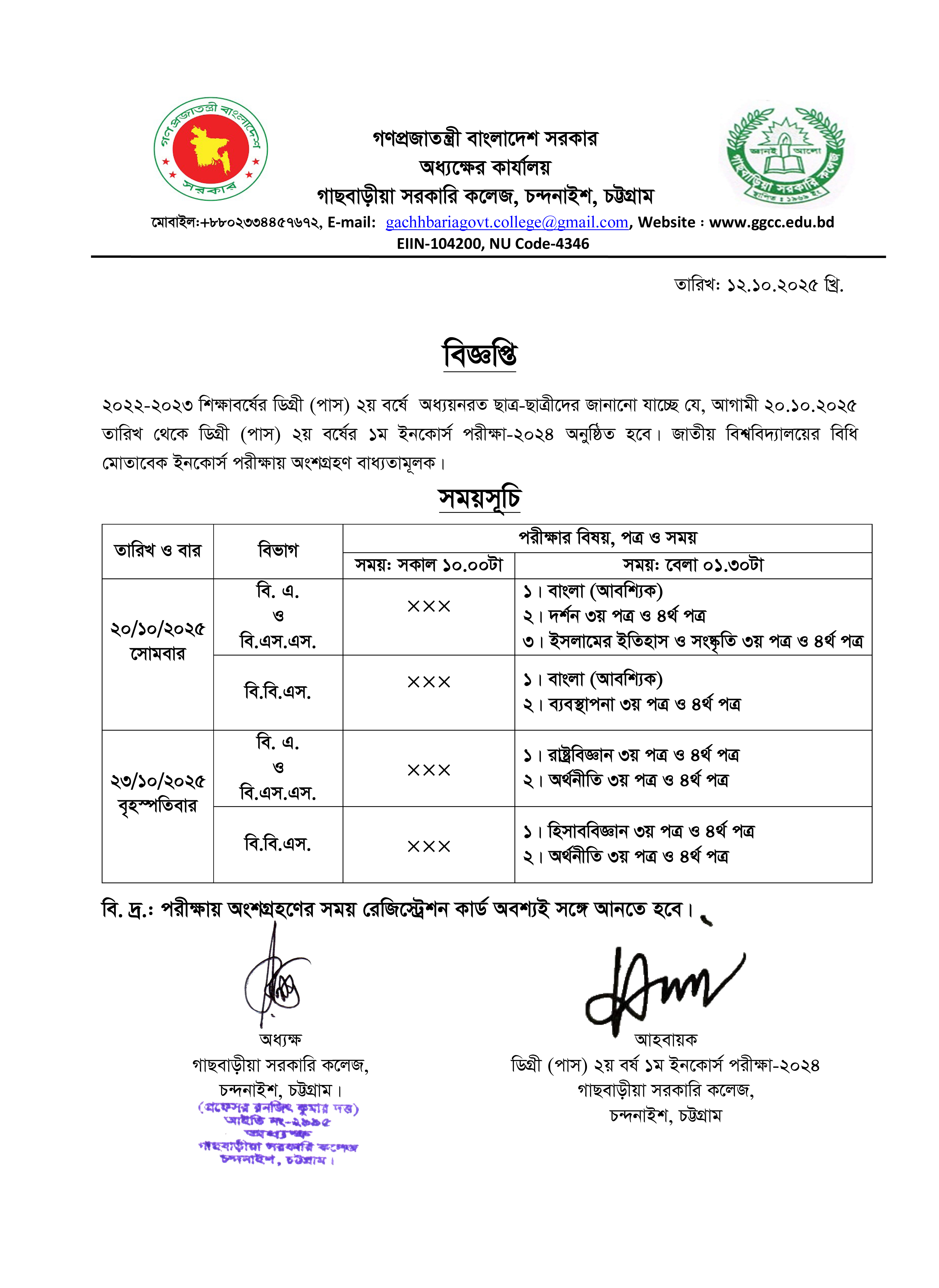 ডিগ্রী (পাস) ২য় বর্ষ ১ম ইনকোর্স পরীক্ষার রুটিন