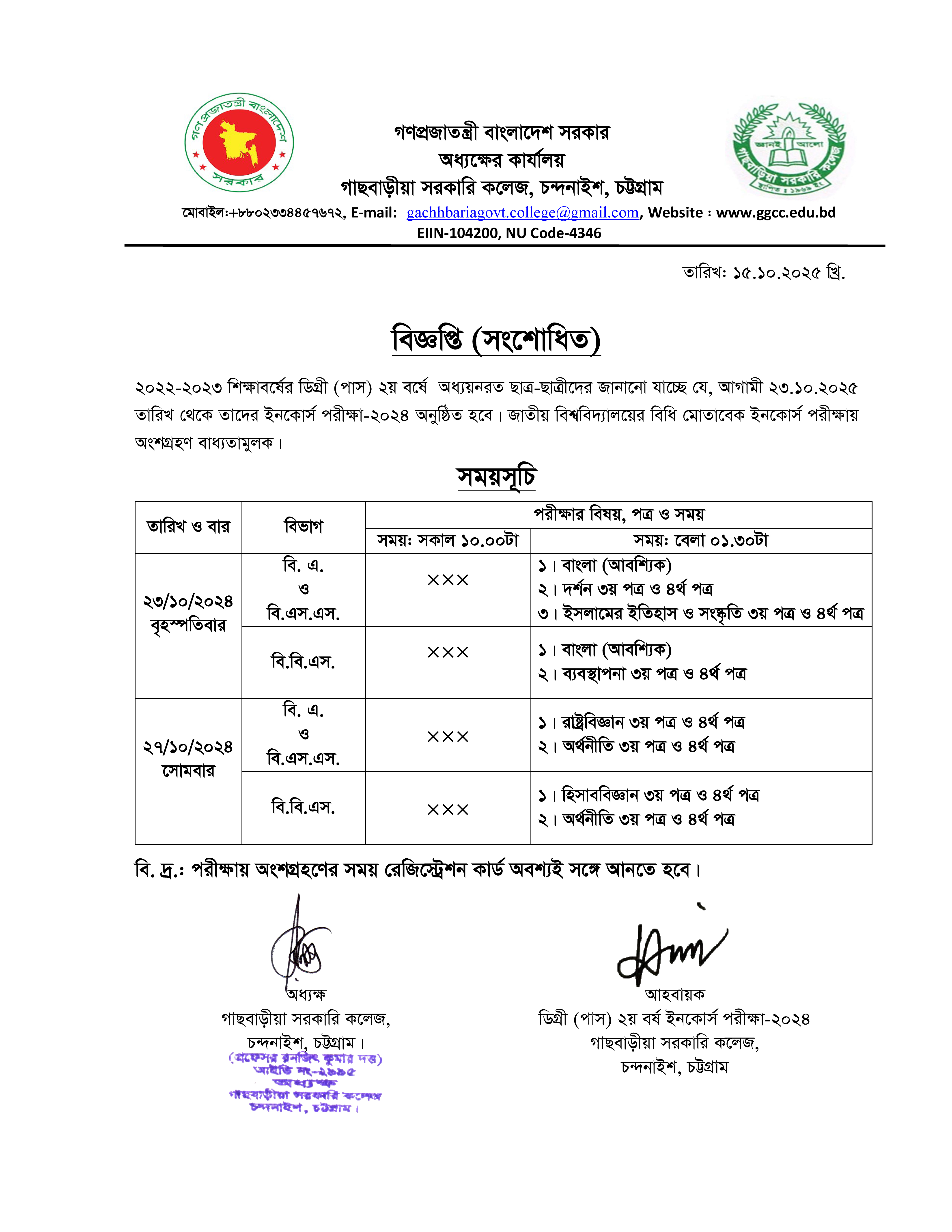 ডিগ্রী (পাস) ২য় বর্ষ ১ম ইনকোর্স পরীক্ষার রুটিন (সংশোধিত)