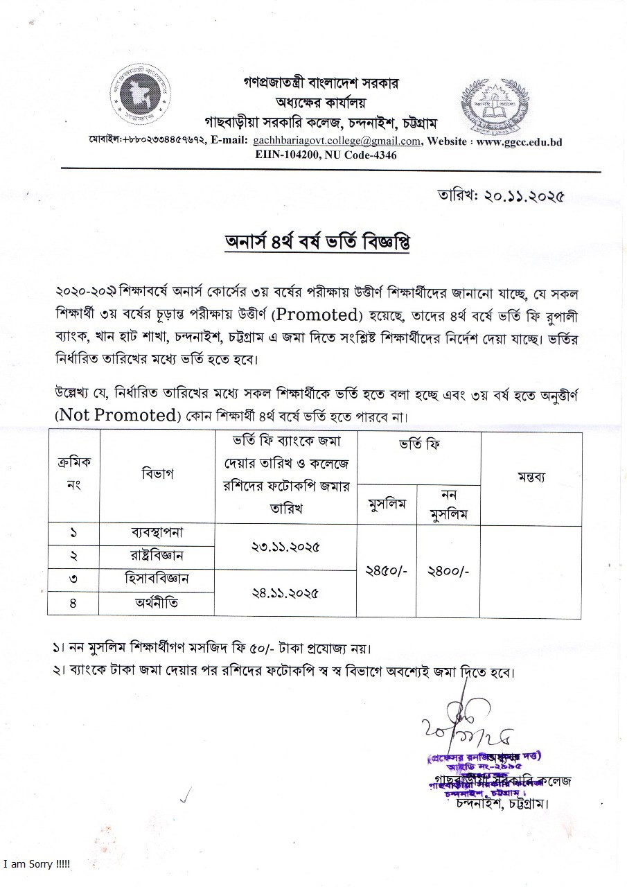 অনার্স ৪র্থ বর্ষ ভর্তি বিজ্ঞপ্তি