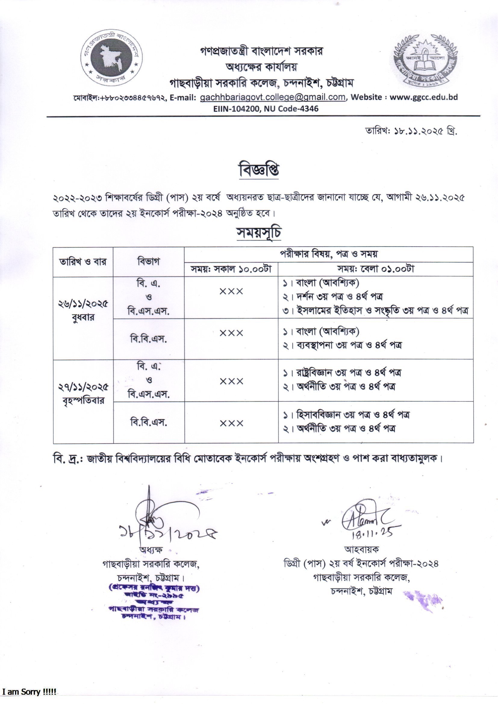ডিগ্রী (পাস) ২য় বর্ষ ২য় ইনকোর্স পরীক্ষার রুটিন