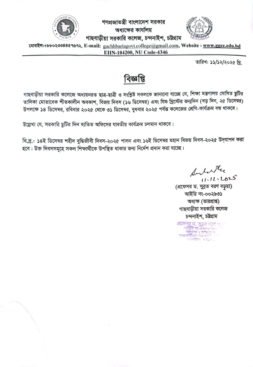 শ্রেণি-কার্যক্রম বন্ধের বিজ্ঞপ্তি (শীতকালীন অবকাশ)