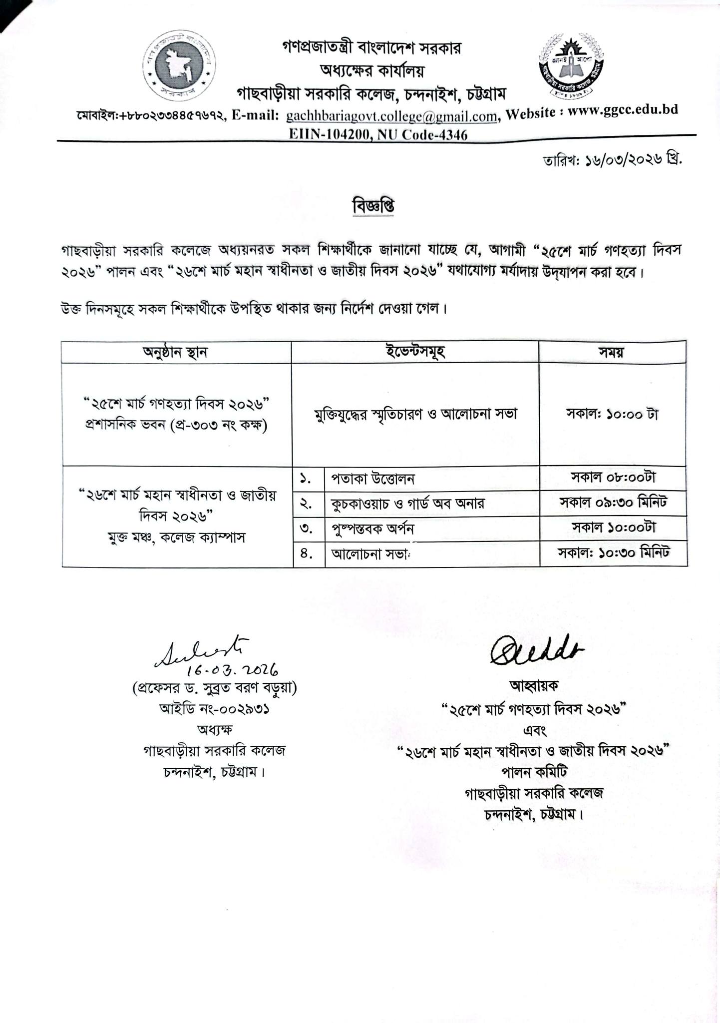 ২৫শে মার্চ গণহত্যা দিবস ও ২৬শে মার্চ মহান স্বাধীনতা ও জাতীয় দিবস এর বিজ্ঞপ্তি