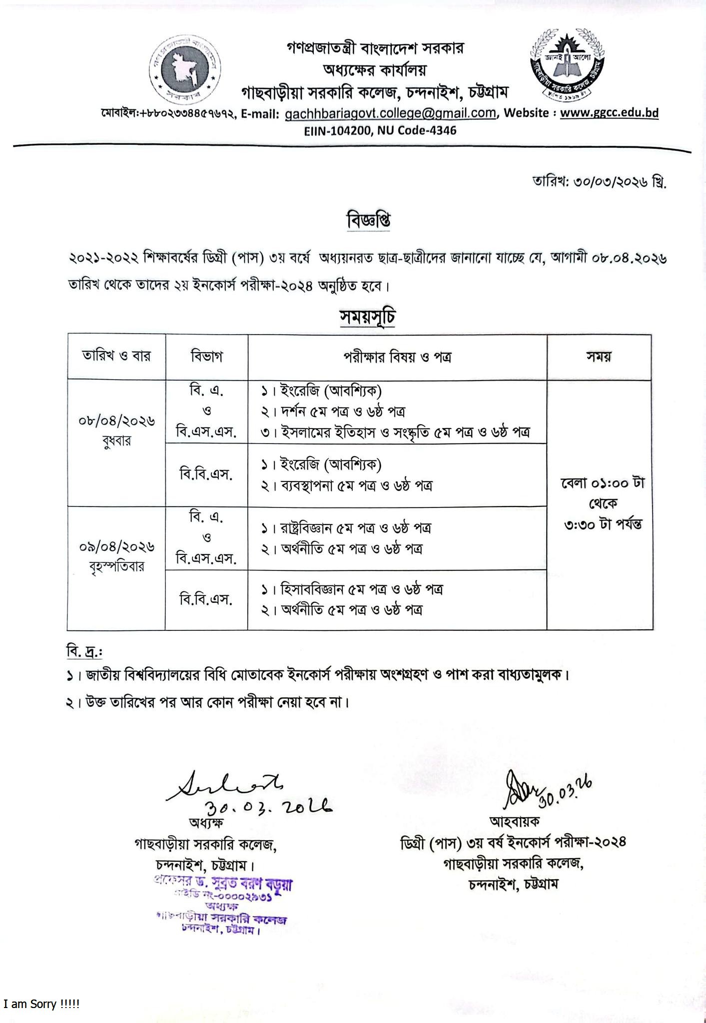 ডিগ্রী (পাস) ৩য় বর্ষ ২য় ইনকোর্স পরীক্ষা-২০২৪ এর সময়সূচি