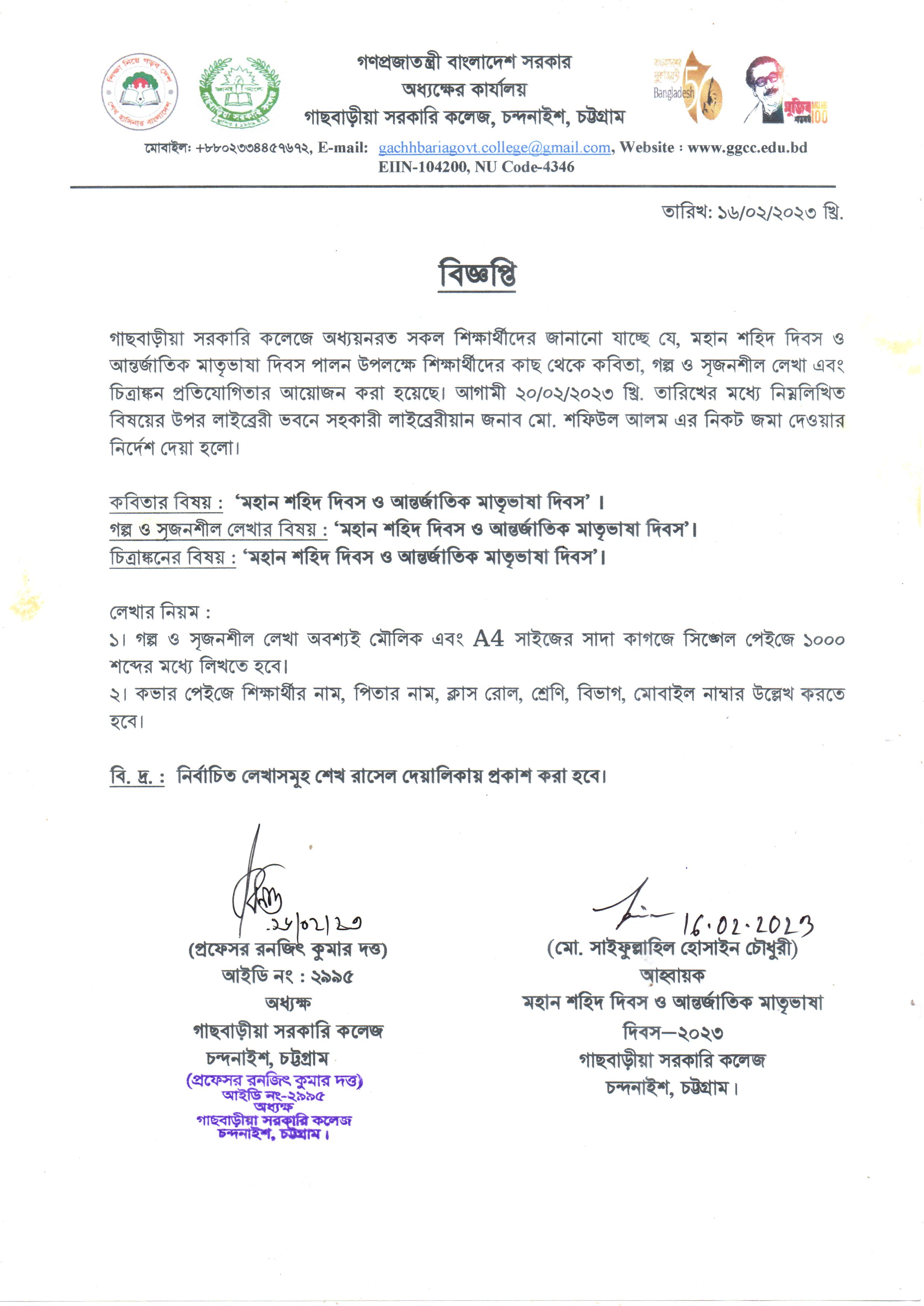 মহান শহিদ দিবস ও আন্তর্জাতিক মাতৃভাষা দিবস- ২০২৩ পালন উপলক্ষে শিক্ষার্থীদের বিভিন্ন প্রতিযোগিতা সংক্রান্ত