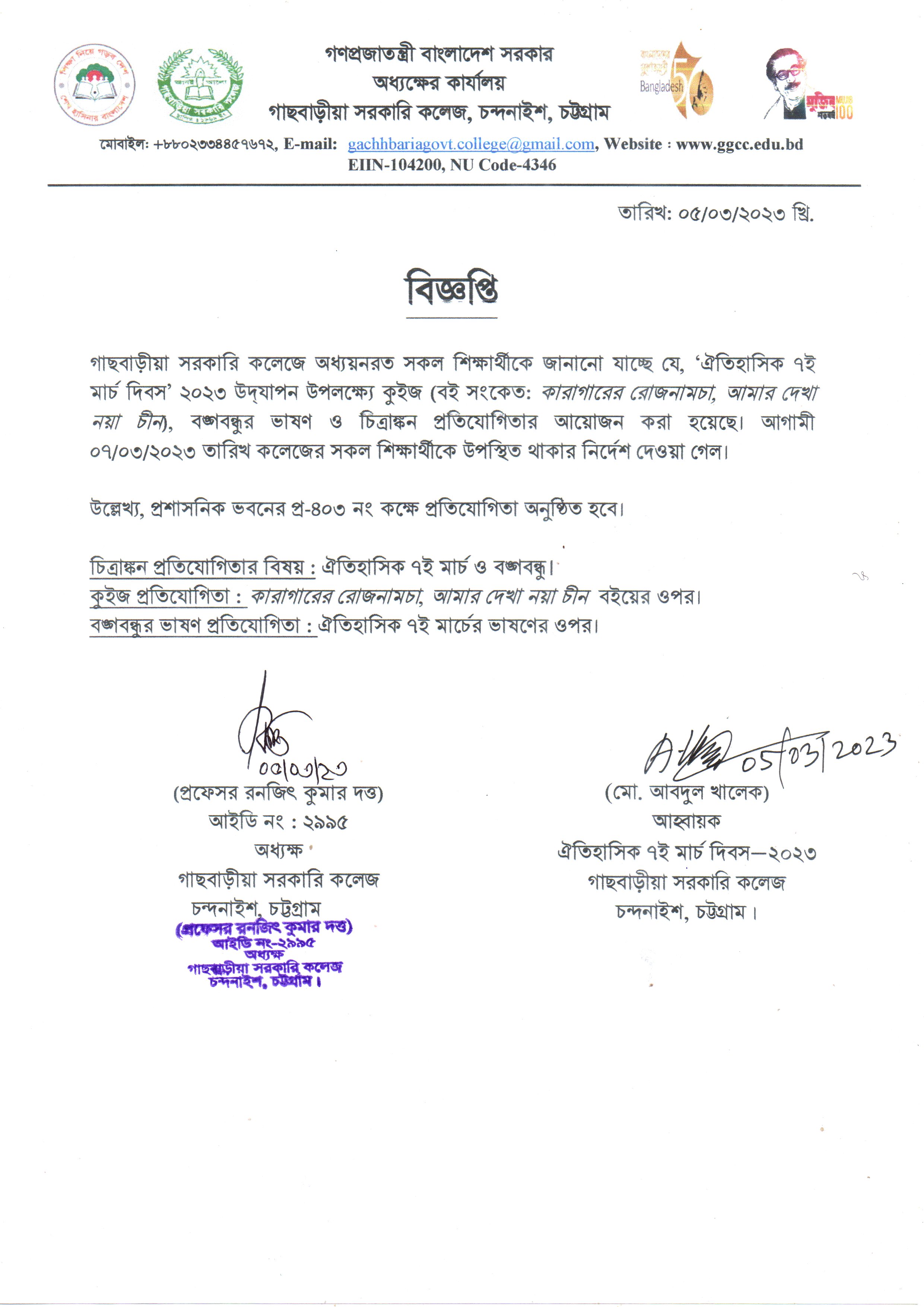 ‘ঐতিহাসিক ৭ই মার্চ দিবস’ ২০২৩ উদযাপন উপলক্ষ্যে কুইজ,বঙ্গবন্ধুর ভাষণ ও চিত্রাঙ্কন প্রতিযোগিতা
