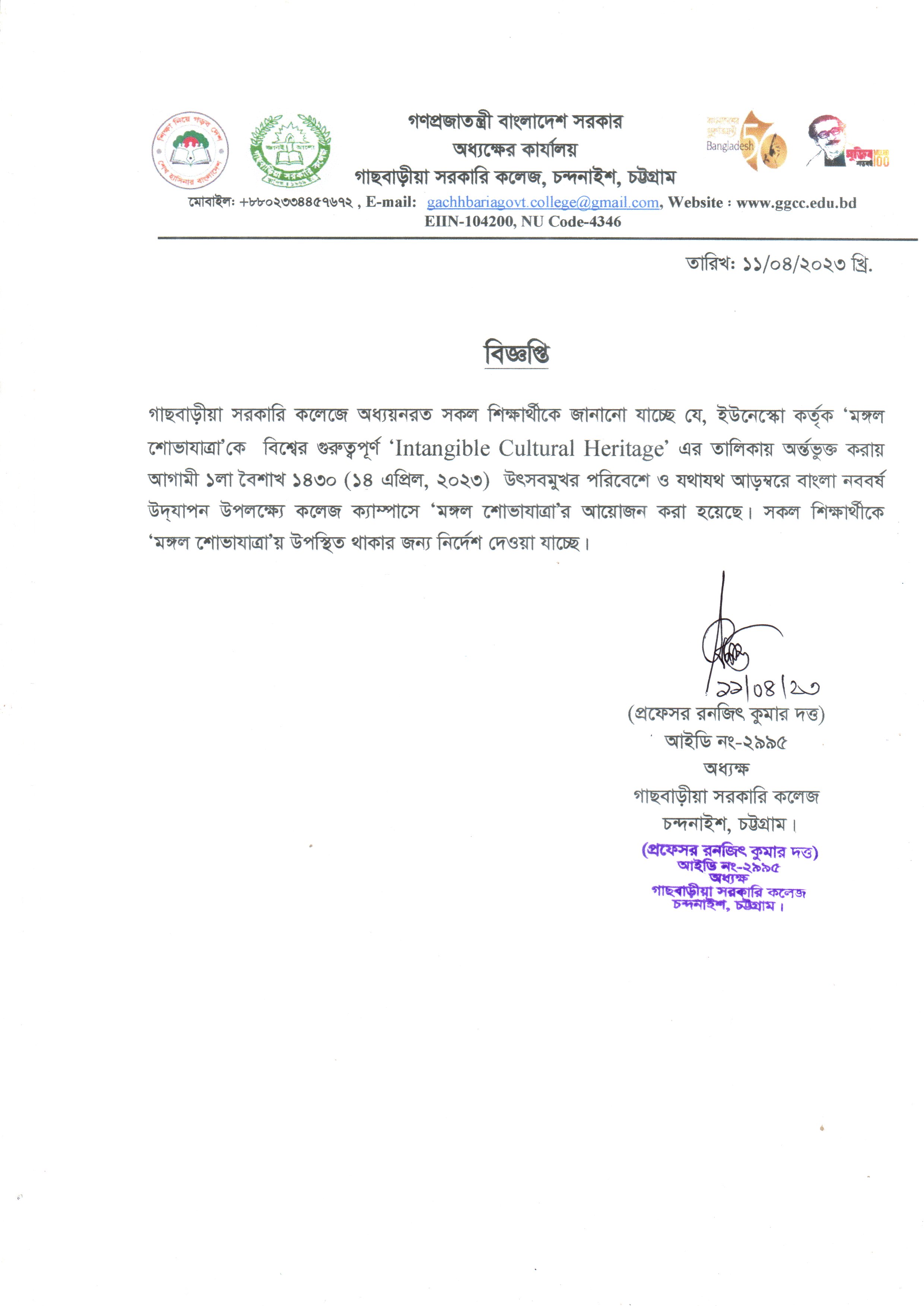 বাংলা নববর্ষ-১৪৩০ উদযাপন উপলক্ষ্যে ‘মঙ্গল শোভাযাত্রা’য় অংশগ্রহণ প্রসঙ্গে।