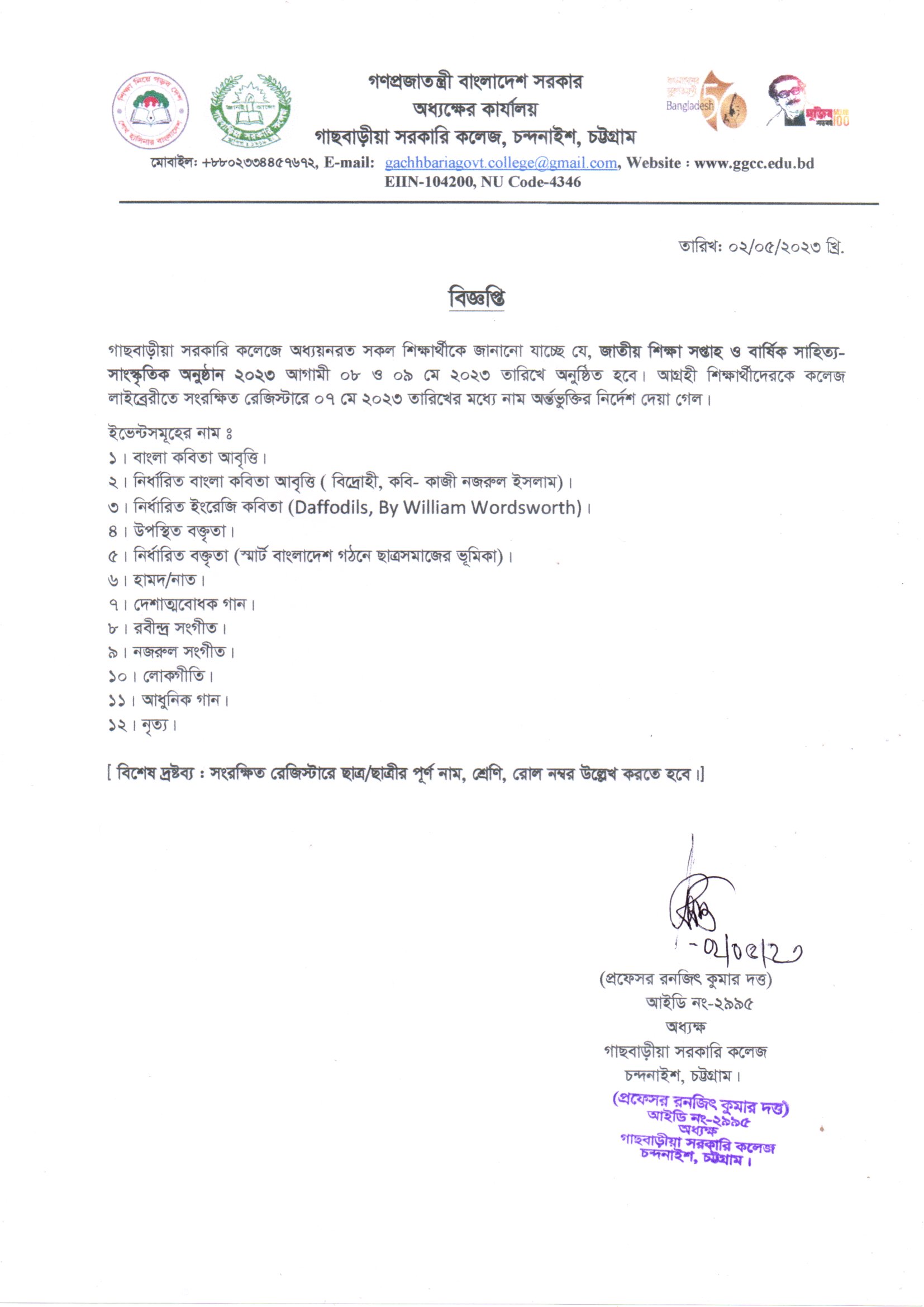 জাতীয় শিক্ষা সপ্তাহ ও বার্ষিক সাহিত্য সাংস্কৃতিক অনুষ্ঠান-২০২৩ এর বিজ্ঞপ্তি