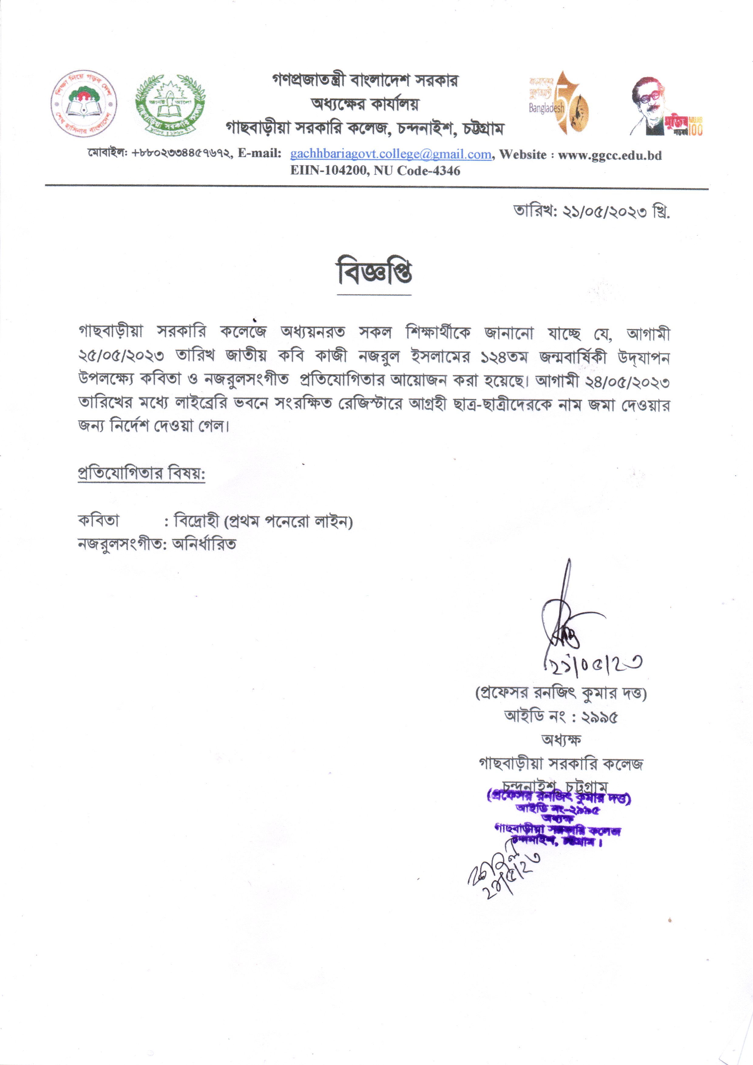 জাতীয় কবি কাজী নজরুল ইসলামের ১২৪তম জন্মবার্ষিকী উপলক্ষ্যে কবিতা ও নজরুলসংগীত প্রতিযোগিতার বিজ্ঞপ্তি